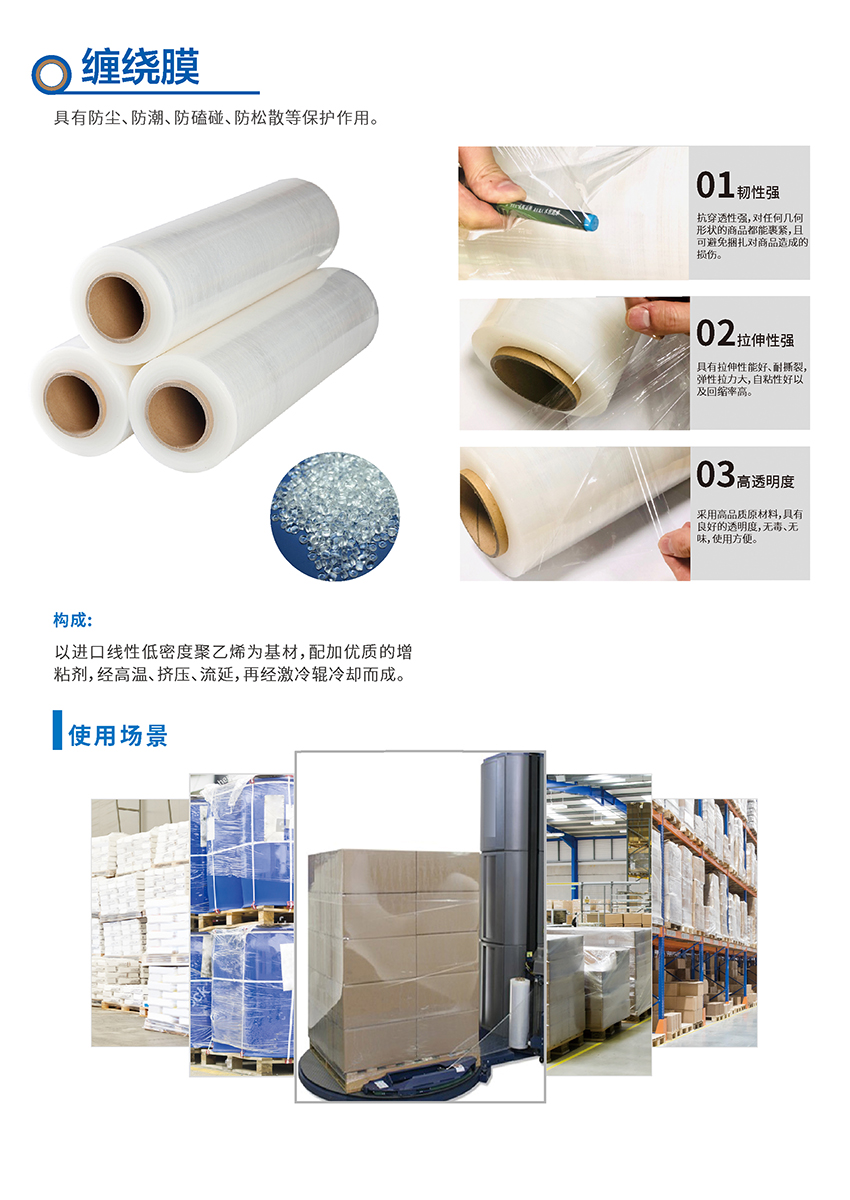 手用拉伸膜選用進口線性低密度聚乙烯(LLDPE),具有拉伸性能好、回縮力強、透明度高、耐穿刺性能好和自粘等優(yōu)點。是無毒無害的柔軟聚乙烯塑料薄膜,可在不加熱的情況下,進行縱橫雙向冷拉伸,依靠它本身自粘性包裝各種產品,并可使貨物長期保持張力而不至于松散,強度高、彈性拉力大、對任何形狀的物品都能裹緊,裹成一個整體。無論是用于產品之集體打包或貨物之托盤包裝,均能達到防潮、防塵、減少人工、提高效率及降低成本之目的,適用于各行各業(yè)。