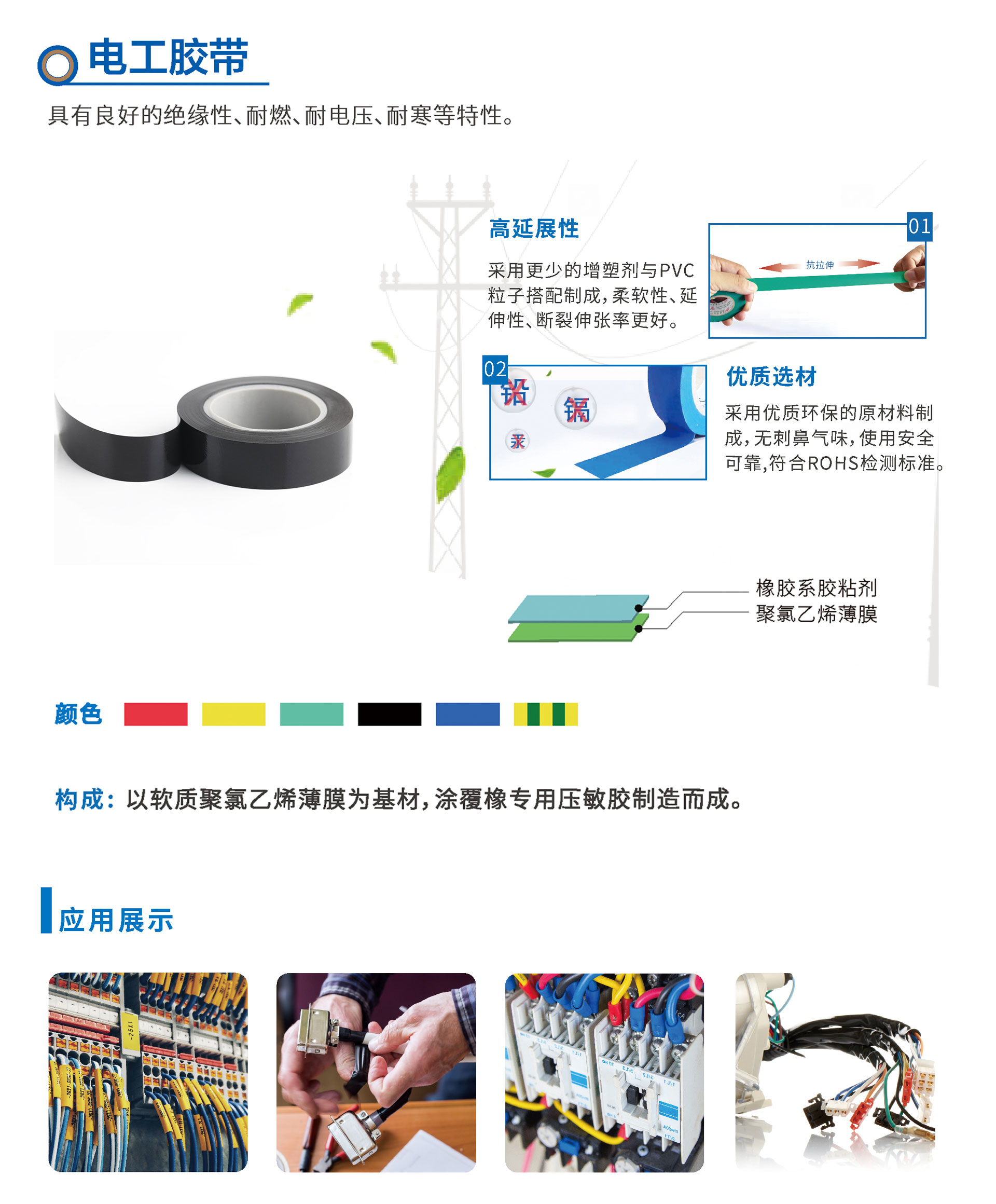 以軟質聚氯乙烯( PVC)薄膜為基材,涂UL專用壓敏膠制造而成。具有良好的絕緣性、耐燃、耐電壓、耐寒等特性。